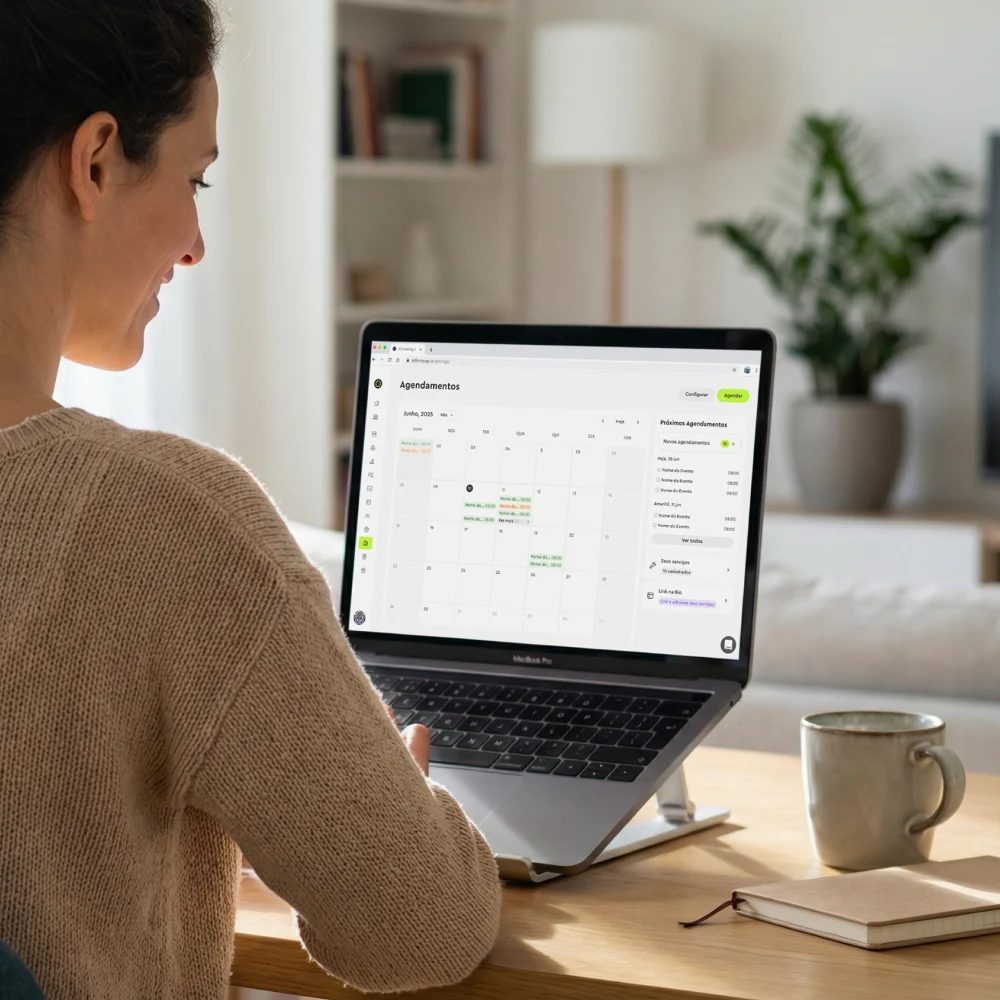 Você compartilha o link do serviço via WhatsApp, redes sociais ou loja online. O cliente acessa, escolhe o horário disponível e agenda com poucos cliques.