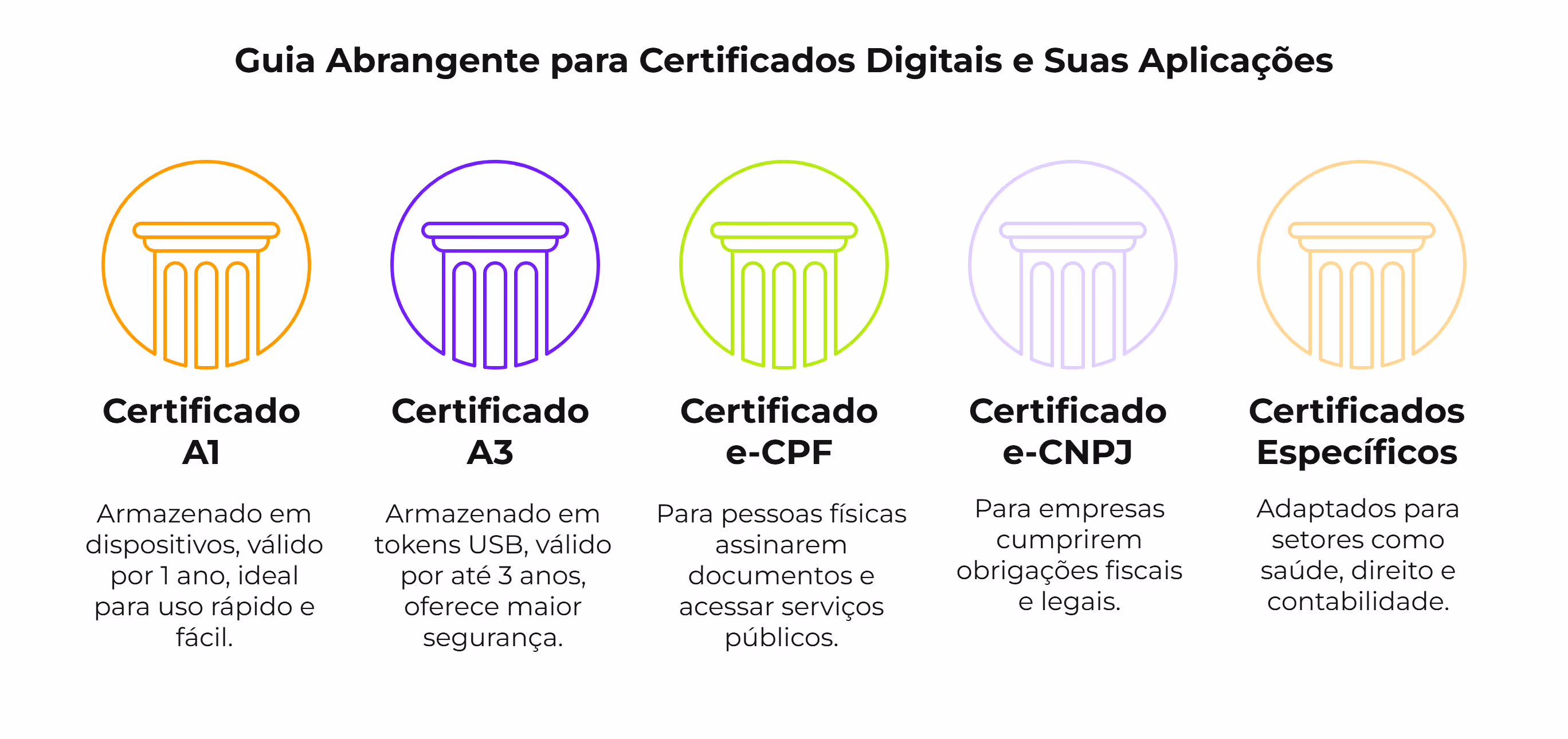 - Tipos principais: A1 (arquivo digital, validade de 1 ano) e A3 (token/cartão, validade de 1 a 3 anos), além de variações como e-CPF e e-CNPJ.
