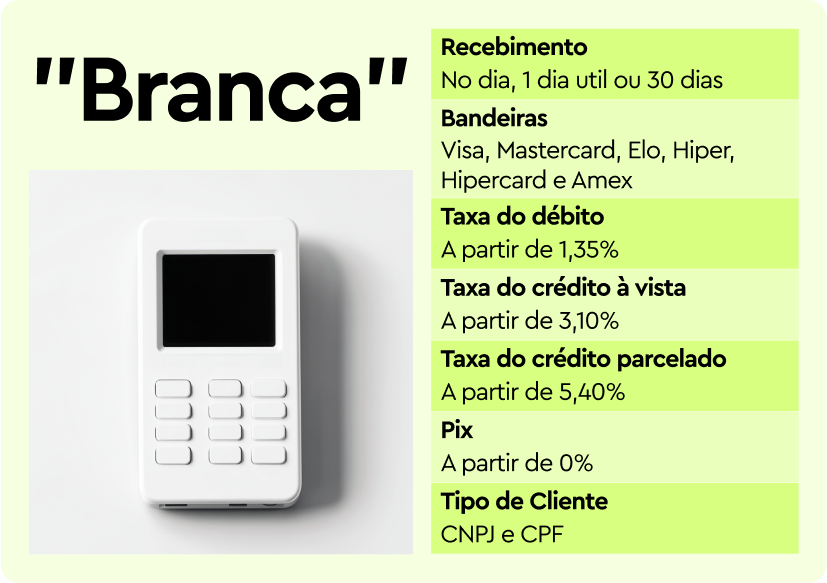 A maquininha “branca” é uma das opções mais conhecidas entre pequenos empresários e autônomos que precisam de uma maquininha sem muita burocracia. Seus modelos oferecem taxas acessíveis para débito e prazos de recebimento que podem ser imediatos ou dentro de um a dois dias.