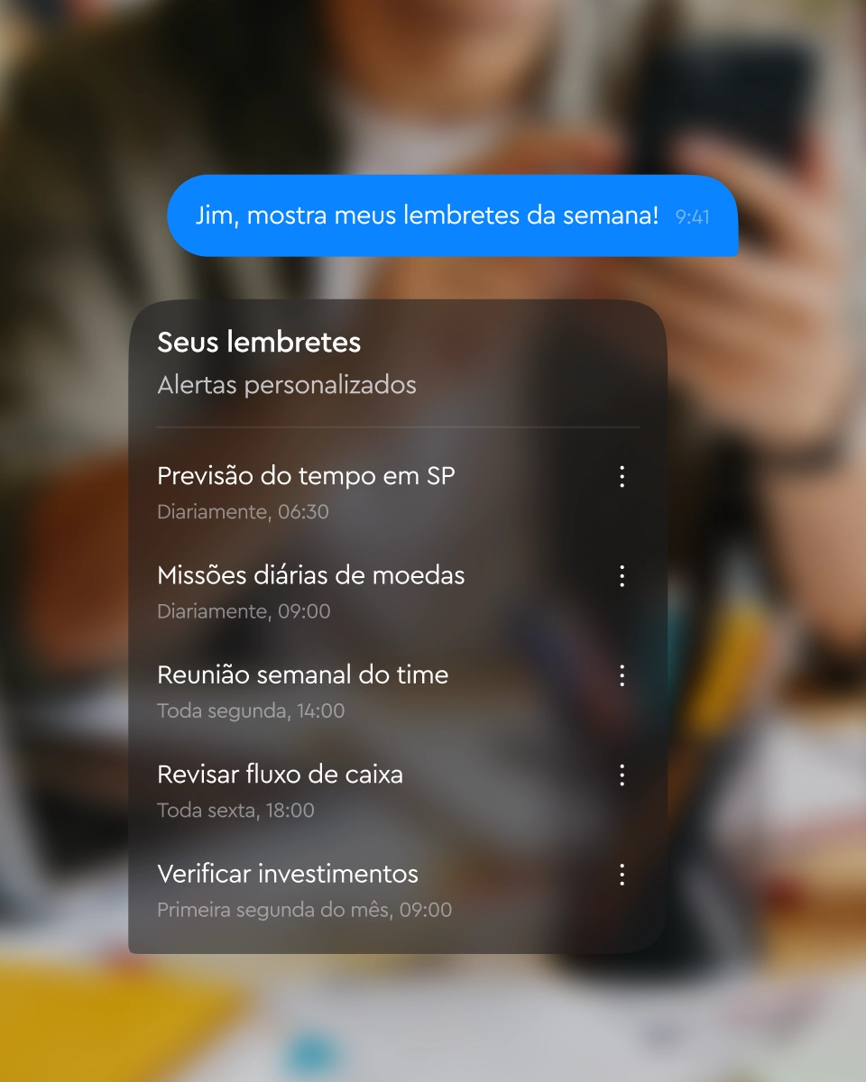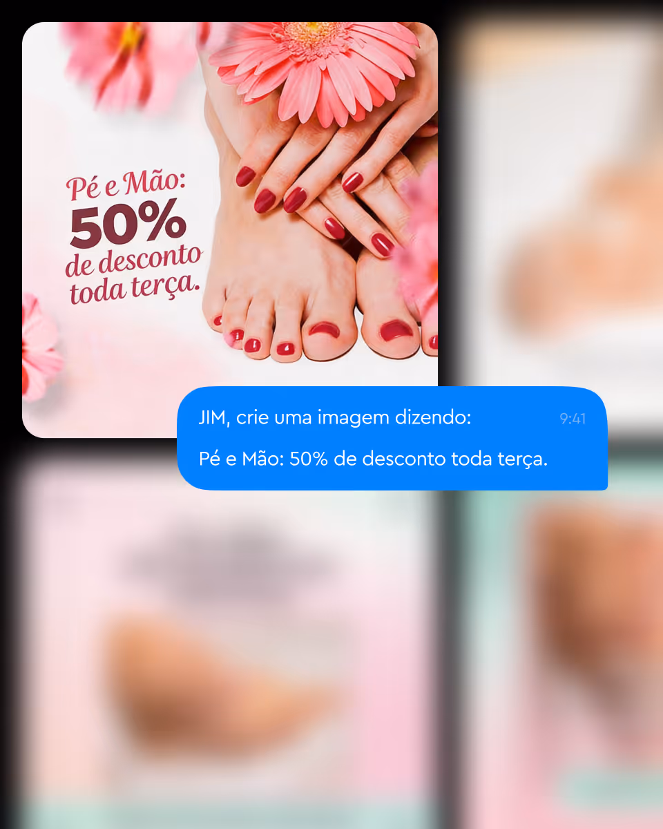 Basta pedir no chat: “JIM, crie uma imagem [e descreva sua ideia]”. Ele gera imagens e textos prontos para redes sociais em segundos, com base no que você pedir.