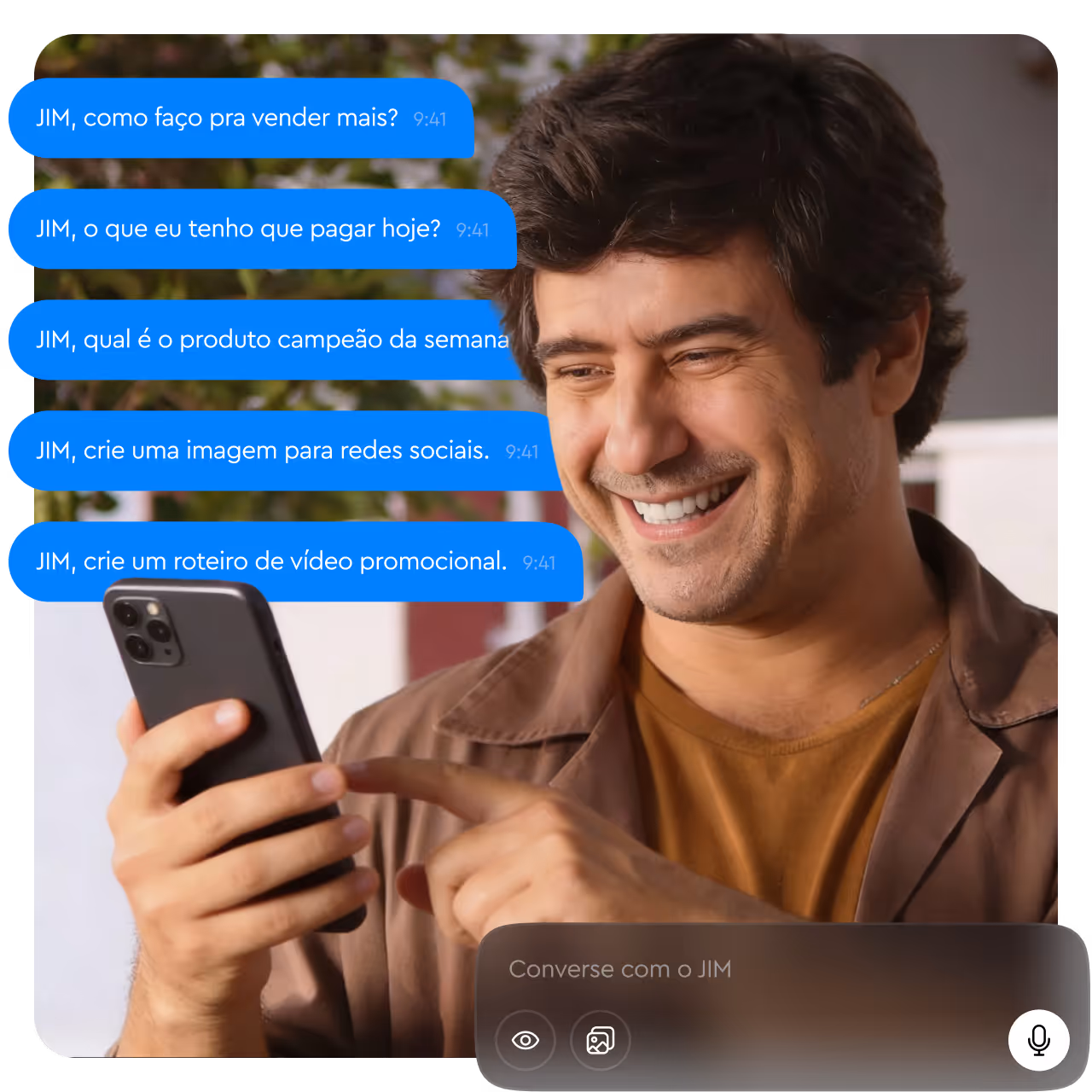 O JIM ajuda em várias frentes do negócio. Ele pode responder perguntas sobre vendas e resultados, fazer pagamentos, gerar relatórios, sugerir decisões com base nos seus dados, ajudar na precificação, criar campanhas de marketing, organizar tarefas e automatizar ações do dia a dia, sempre com foco em facilitar a gestão e acelerar o crescimento do negócio.