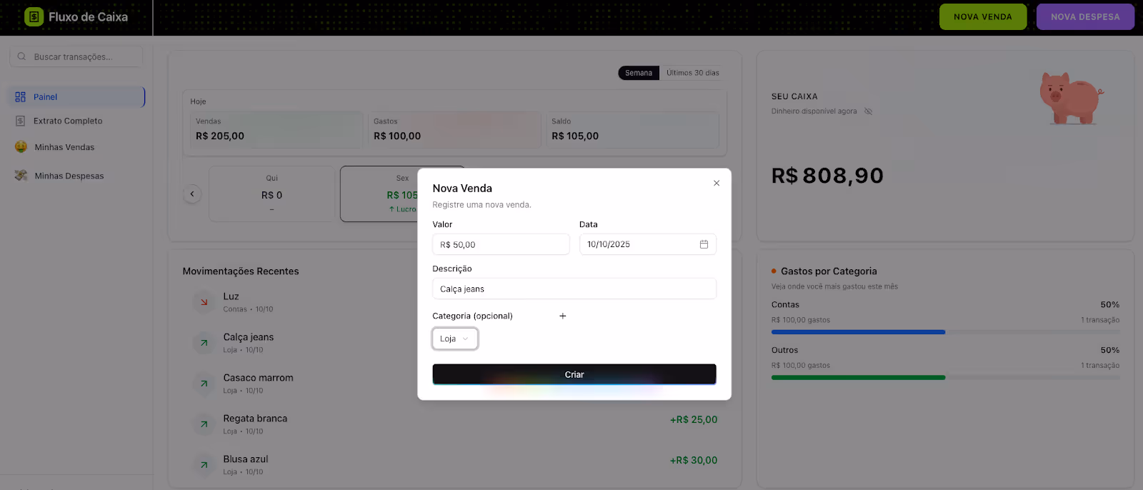 Tudo é simples, rápido e visual: você registra suas vendas e despesas, acompanha o saldo e entende para onde vai o dinheiro do seu negócio.