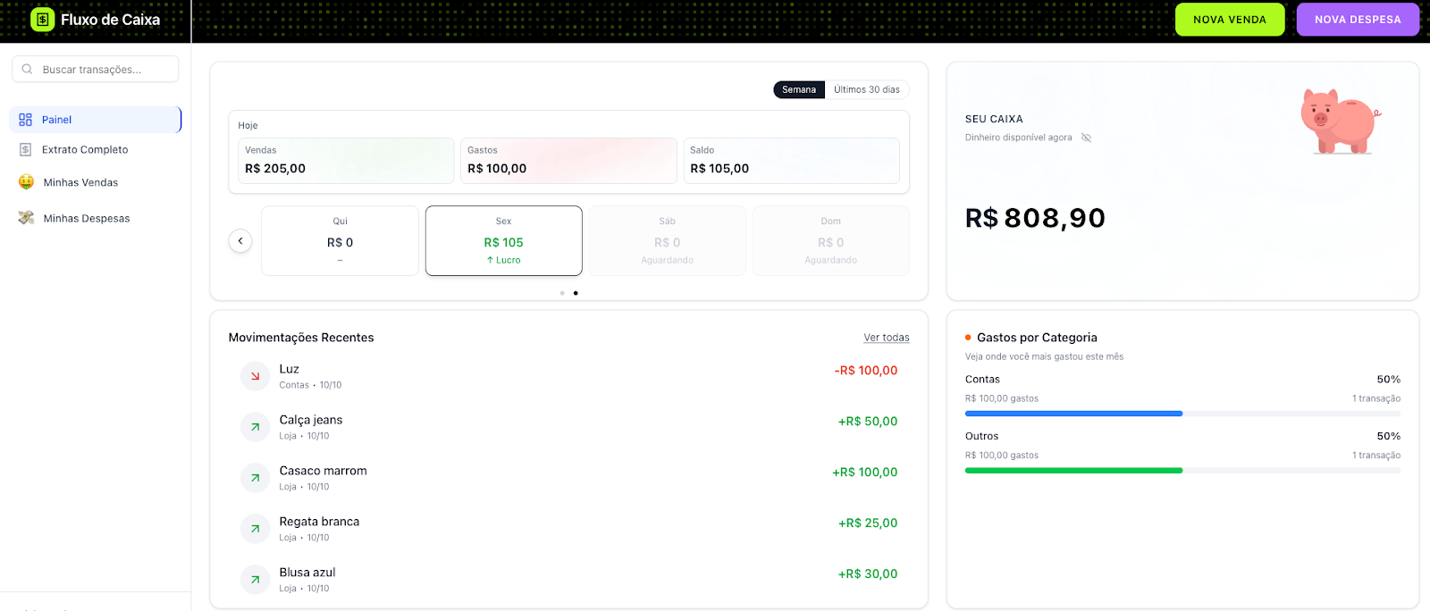 Assim que fizer login, você verá o resumo completo do seu negócio: total de vendas, despesas e saldo do caixa, além de gráficos de desempenho e um card exclusivo com a visão da sua semana, mostrando em quais dias houve lucro ou prejuízo.