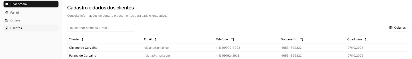 Na aba Clientes, é possível consultar todos os cadastros, editar dados e visualizar o histórico de serviços prestados.