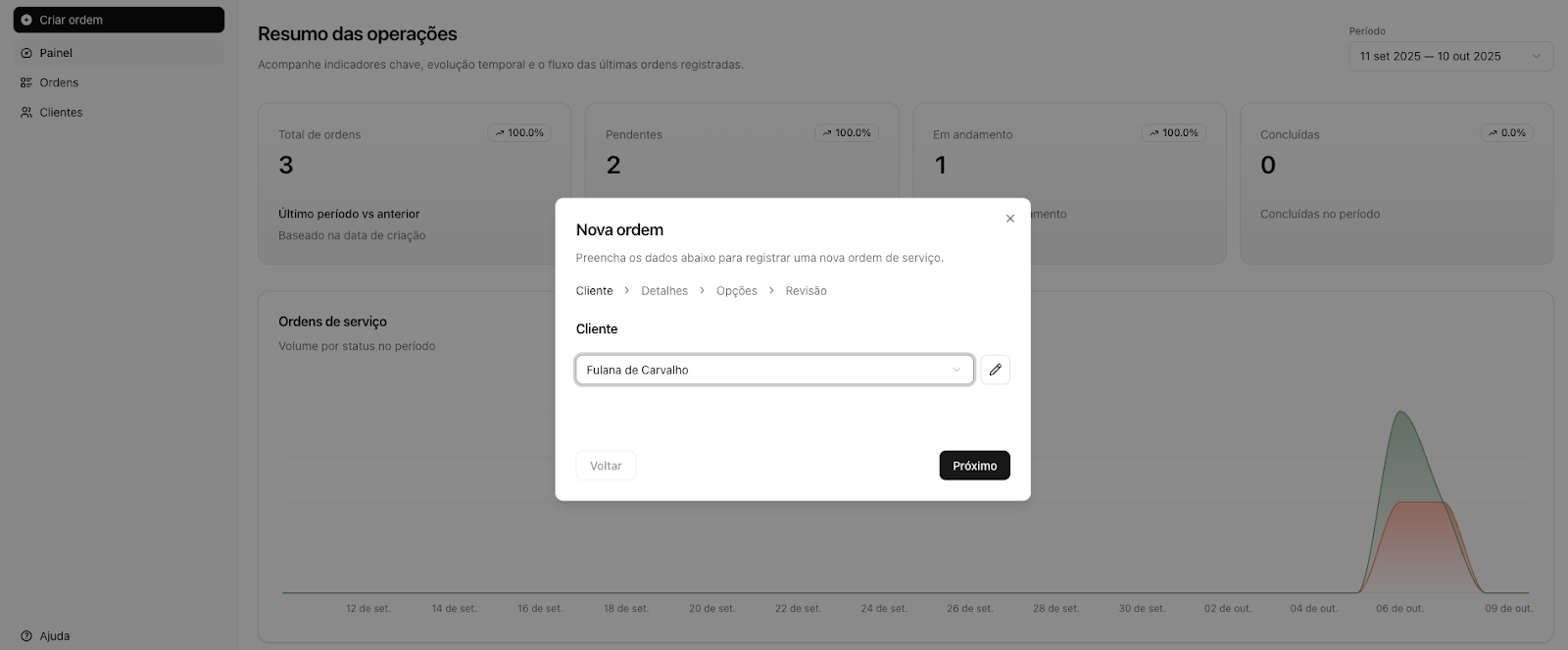 Confira todos os dados (cliente, valores, prioridade e data) e clique em Criar para gerar sua ordem de serviço digital.
