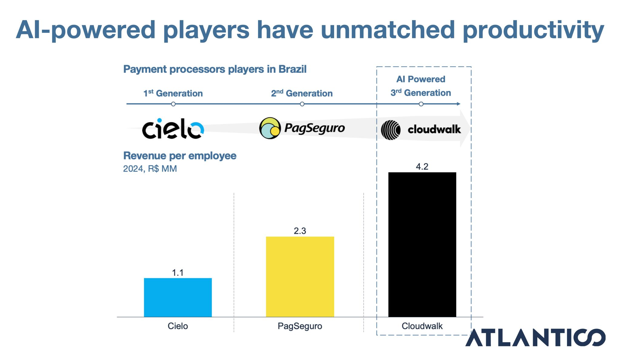 “Não são apenas os consumidores que estão adotando IA de forma acelerada, mas também as empresas. Os players nativos em IA estão superando amplamente os rivais. No espaço hipercompetitivo de pagamentos, empresas modernas que abraçam a IA, como a CloudWalk, têm uma receita por colaborador 2x maior que a dos players de segunda geração e 4x maior que a dos incumbentes tradicionais de primeira geração.”